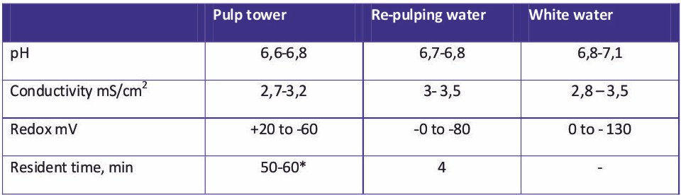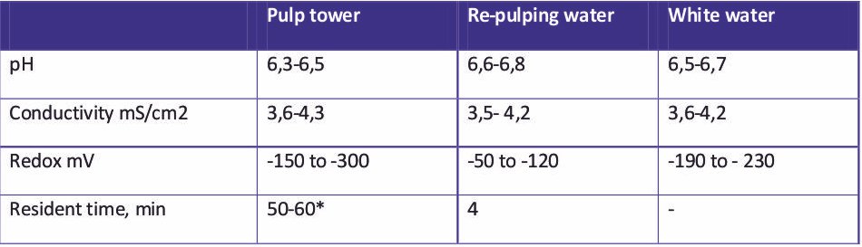 To investigate the effect of chlorine dioxide for starch degradation was a full scale performed with Chlorine dioxide based on chlorate based chemistry. Paper grade was 100% recycle liner board with a production of 50 tons/hour, two ply fourdrainer machine. Key parameters in the system presented in the following Table. Values are average numbers for a system without microbiological treatment.
