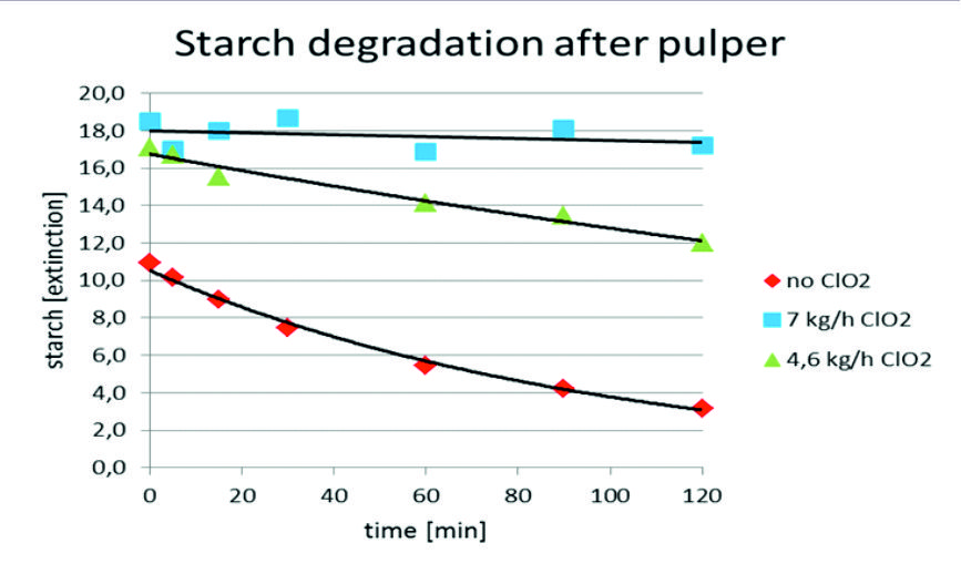 The total dosage of chlorine dioxide was separated in 8 different positions including also the fresh water treatment. The addition was continuously to all positions and the reason is the very fast reaction as well as low persistent. Two different dosing levels were investigated 4,6 and 7 kg ClO2/ton. Starch degradation was analysed in pulp with and without treatment of chlorine dioxide in laboratory and followed up in the paper process.