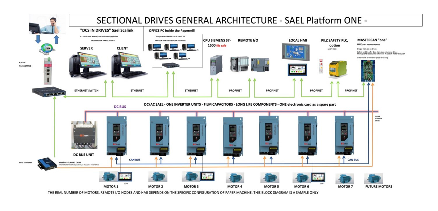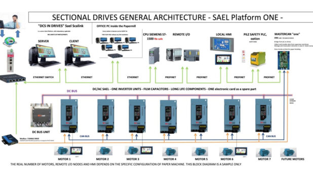 The property of San Martino Papermill, has decided to upgrade not only the drive and automation systems of the carton board machine but also the mill’s overall approach by selecting SAEL as the supplier. SAEL’s philosophy is to provide customers with the most advanced and revolutionary technology available, offering comprehensive solutions that save time and money. SAEL’s scope in this project includes providing new AC drive cabinets and MCC to manage the newly implemented motors and sensors, along with the DCS for the entire plant. The Platform ONE drives and a complete DCS Scalink system will manage the paper machine, reducing costs for spare parts, faults, and substitution times. With Platform ONE drives, San Martino Papermill will only need one electronic card as a spare part.