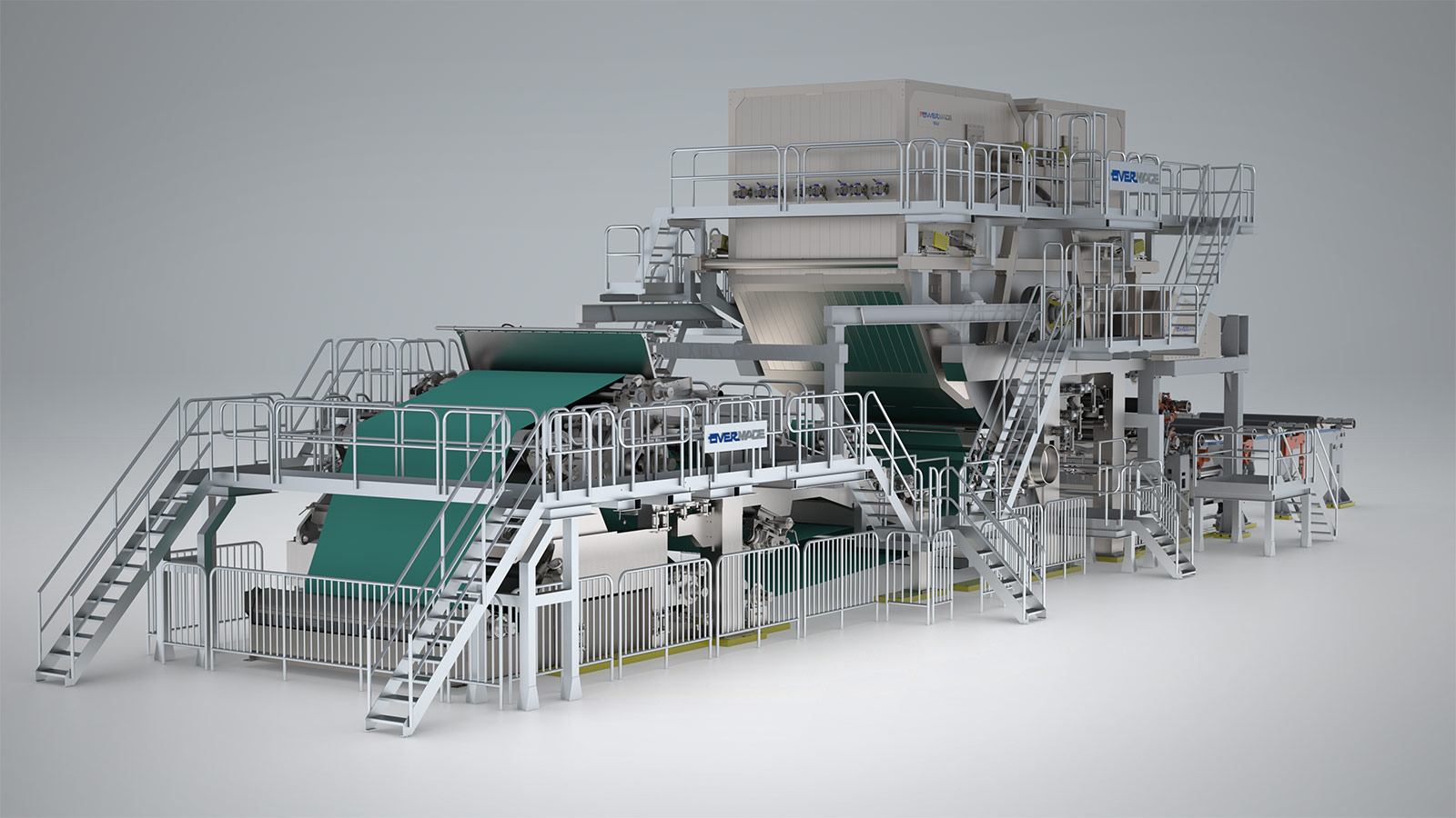 Zain Paper Industry has commissioned the complete lines to Overmade on the basis of a turn-key supply: from Virgin pulper to Approach flow system, from Hydraulic Headbox to Reel, from Winding system to Wrapping line, including all auxiliaries such as Vacuum line, Steam system, High efficiency hood, Mist and Dust removal system. The DCS (Distributed Control System), the QCS (Quality Control System), the Sectional Electrical Drives and the Electrification of the entire tissue mill are also part of the scope of supply.